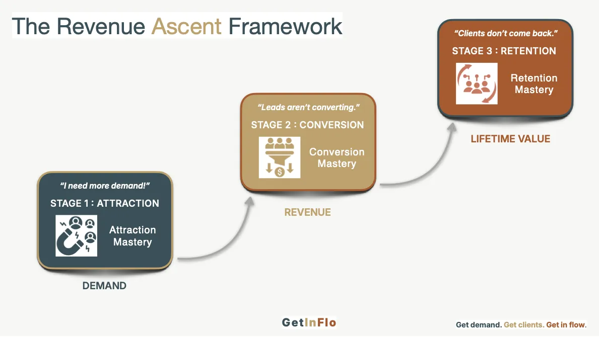 The Revenue Ascent Framework shows the stages of your client journey — from demand to revenue to lifetime value.